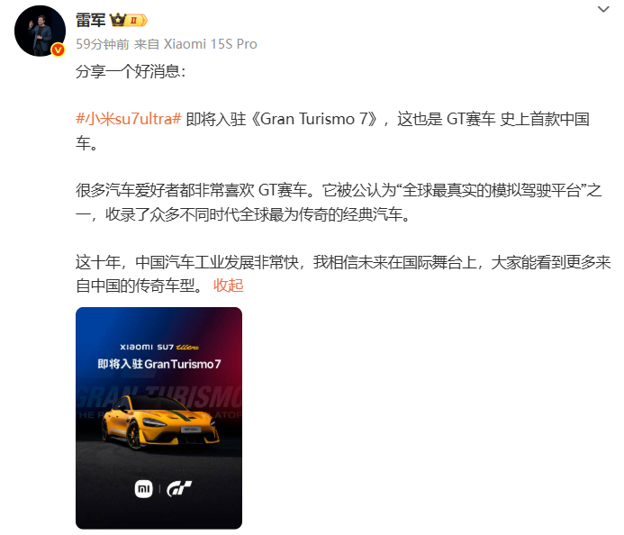 ●雷军:小米SU7 Ultra即将入驻Gran Turismo 7,为GT赛车史上首款中国车。