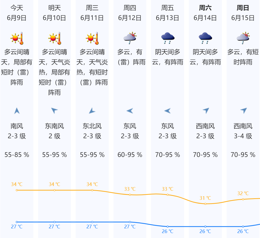 预计10日晴天炎热为主,局地有短时(雷)阵雨,其中9日气温27-34℃,中北部及人口密集区可达35℃或以上;