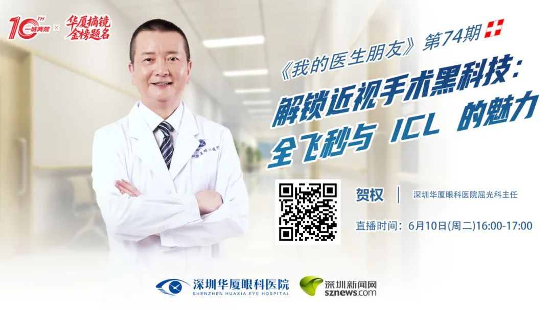 6月10日(周二)16:00-17:00,深圳新闻网《我的医生朋友》栏目将邀请深圳华厦眼科医院屈光科主任贺权做客直播间,聚焦当下热门的两种近视矫正方案——全飞秒SMILE术和EVO ICL晶体植入术。敬请关注!