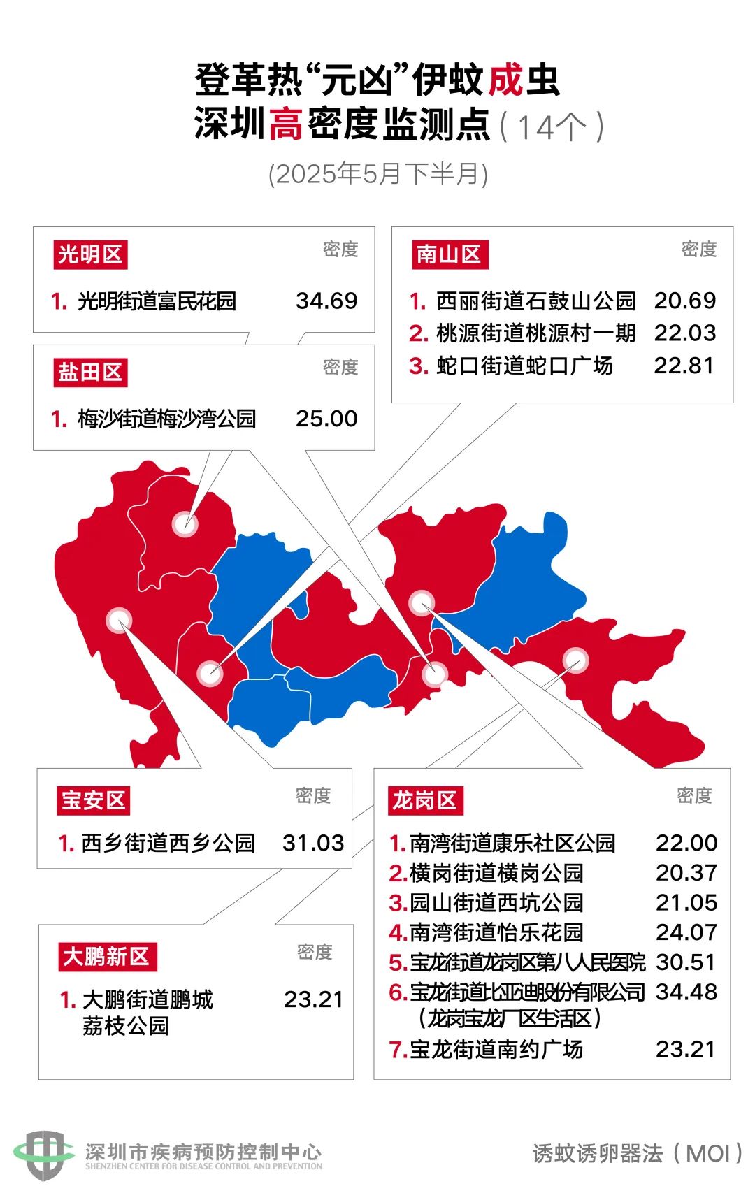 ● 深圳市疾病预防控制中心发布5月下半月(5月16日—31日)的全市伊蚊密度监测结果,高密度监测点有14个。