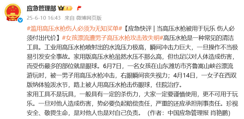 此外,应急管理部官博发文:滥用高压水枪伤人必须为无知买单。