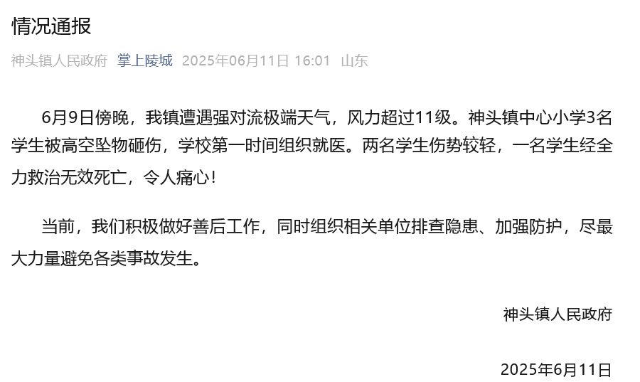 ●山东3名学生被高空坠物砸中致1死2伤,官方通报:遭遇强对流极端天气,风力超过11级。详情>>