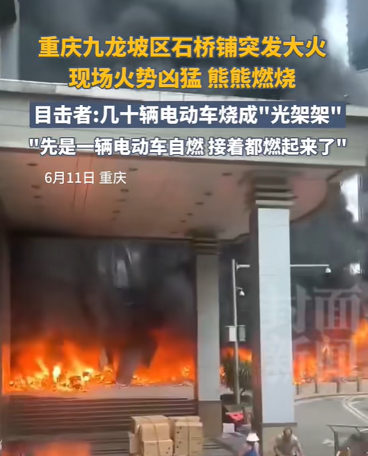 ● 6月11日,重庆九龙坡区发生一起火灾,多辆摩托车和电瓶车被烧,消防通报:明火已扑灭,暂无人员伤亡。