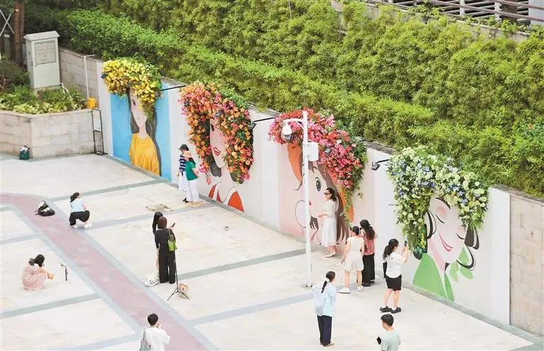 ● 福田:近日,簪花墙绘亮相皇庭广场,吸引众多市民前来打卡拍照。