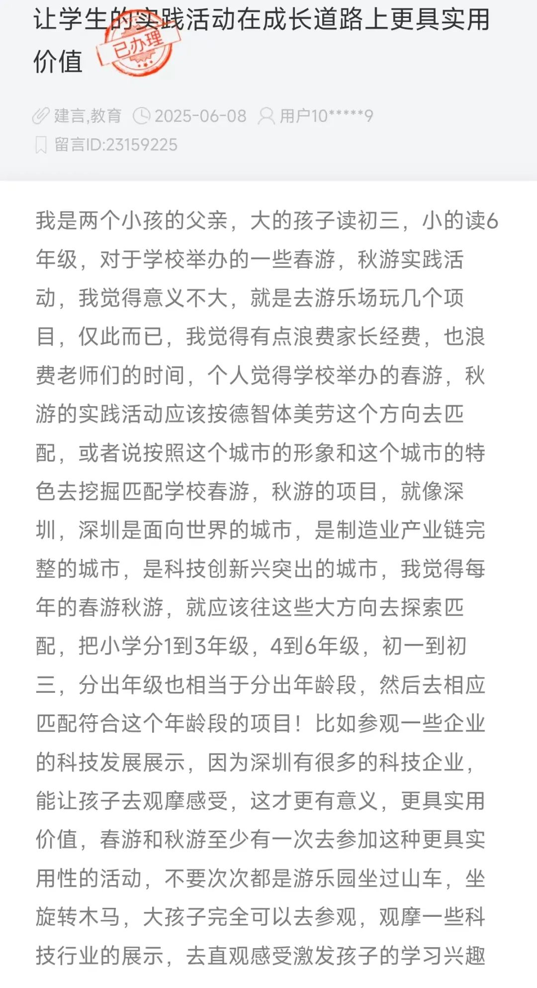 ● 深圳家长建议调整春秋游实践活动内容,对此,深圳教育局回应:已通过会议、通知等多种形式指导学校提升研学实践活动质量。详情>>