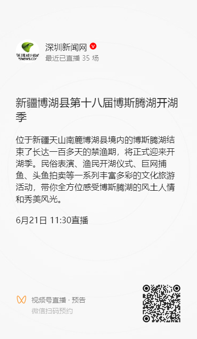 6月21日11:30-14:30,新疆博湖县第十八届博斯腾湖开湖季启幕,民俗表演、巨网捕鱼等活动来袭,快来扫码预约直播~
