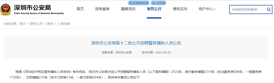 ● 6月20日,深圳市公安局决定公开招聘警务辅助人员2533名。