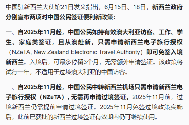 ● 新西兰自2025年11月起对中国公民实行两项签证便利新政策。