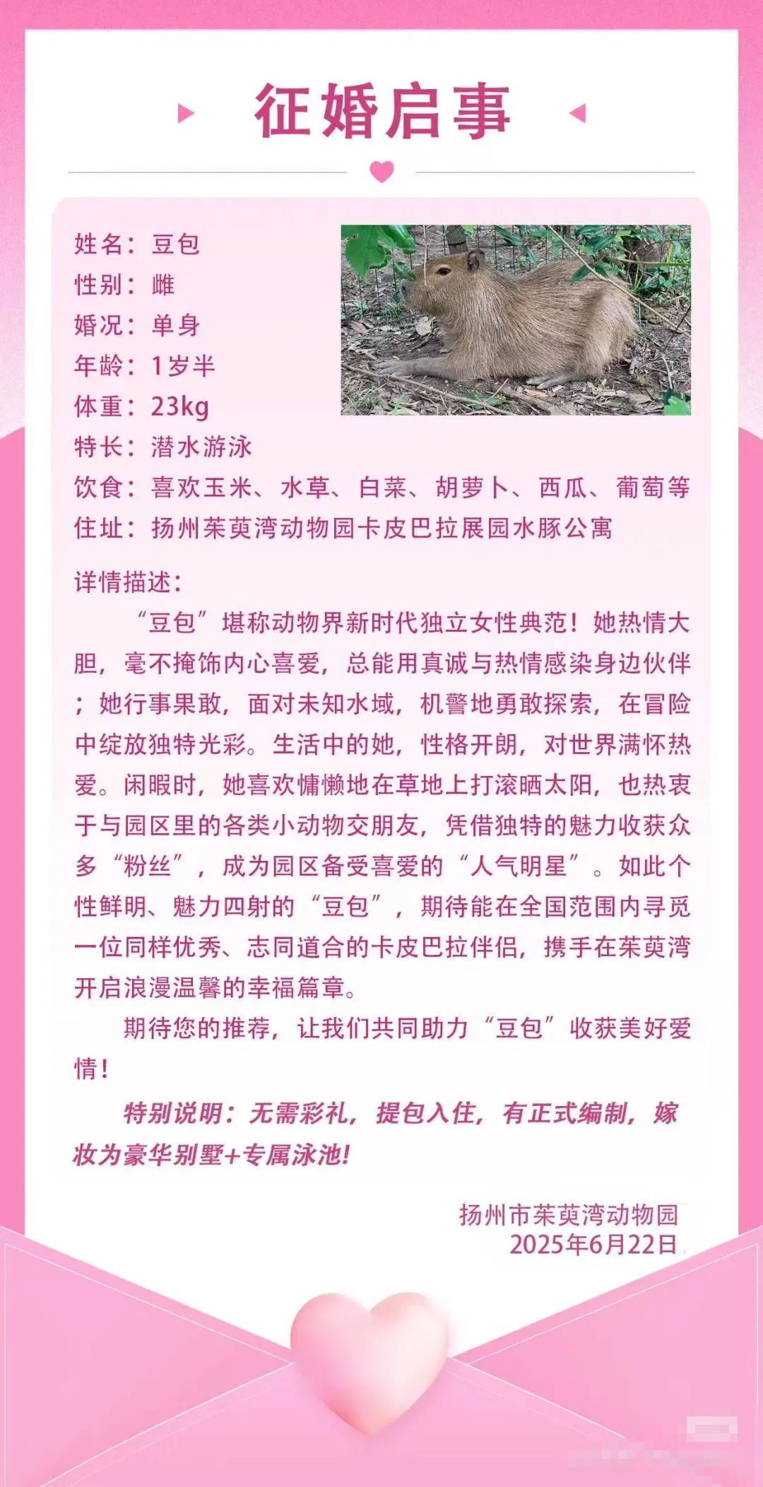 ● 6月22日,扬州市茱萸湾动物园发文,为水豚“豆包”征婚。