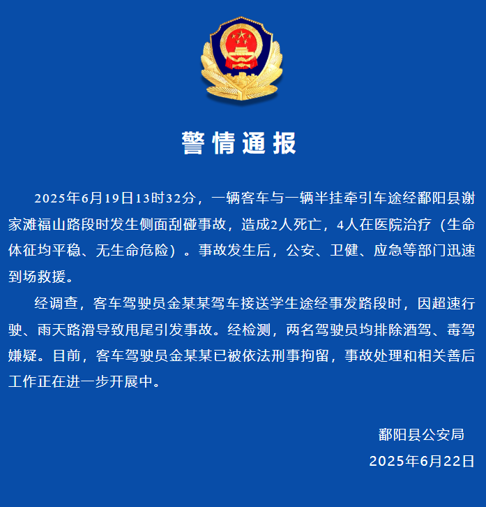 ● 江西一客车接送学生时撞上半挂车致2死4伤,警方通报:客车驾驶员已被刑事拘留。