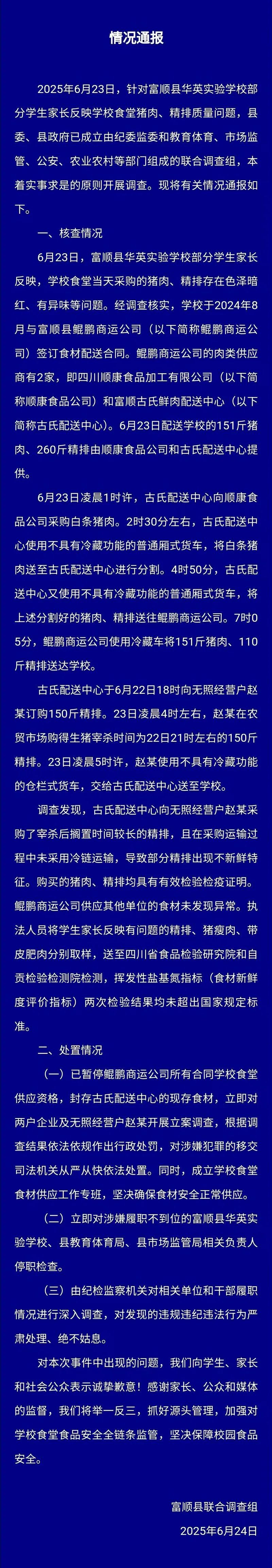 ● 四川自贡一小学被指使用变质猪肉,调查组通报:暂停供应资格,立案调查,相关负责人停职。