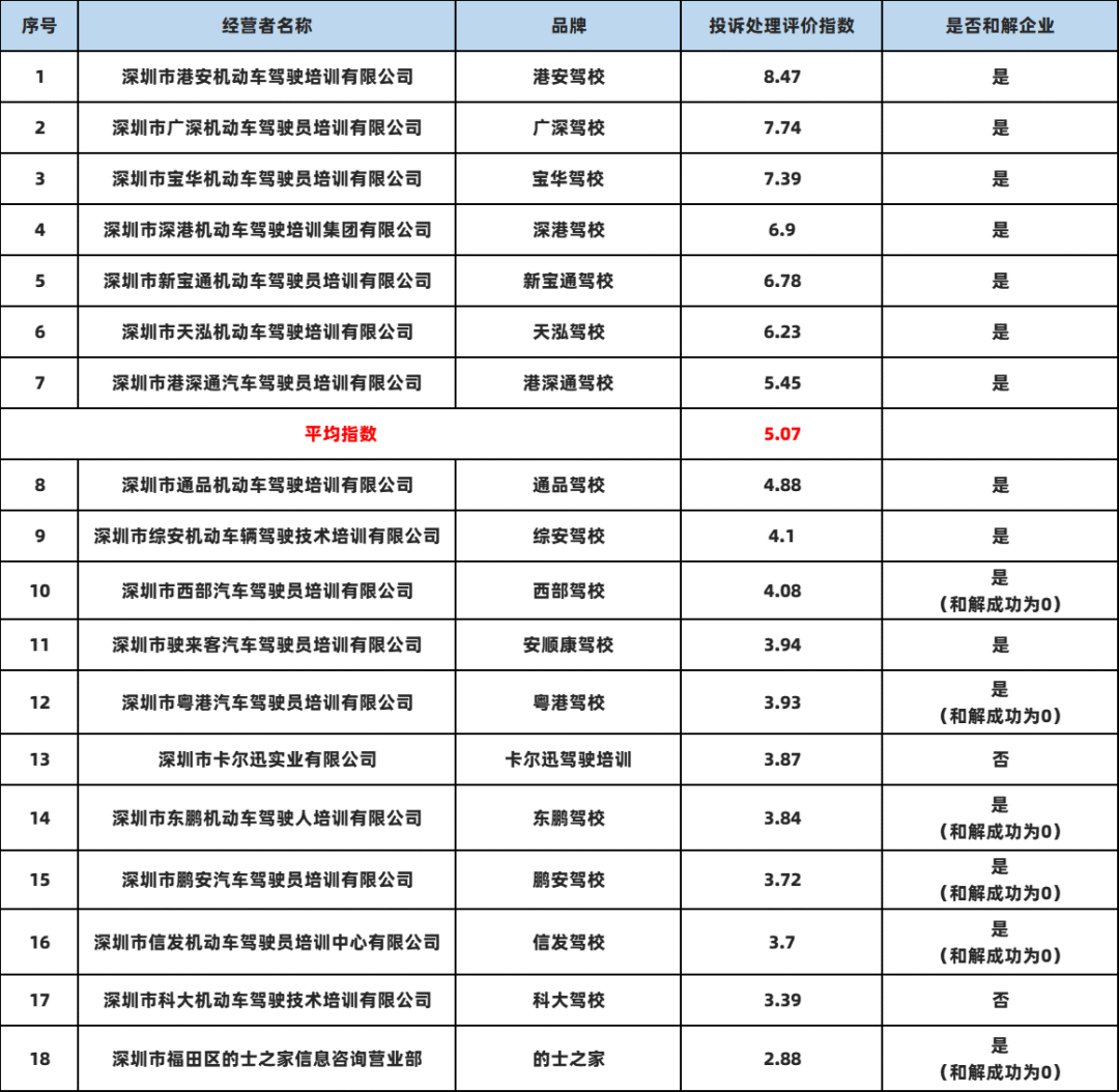 ● 深圳市消委会发布驾驶培训行业经营者投诉处理评价指数排行榜。