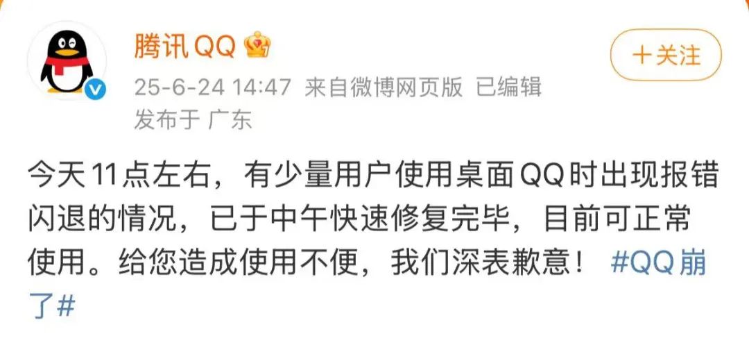 ● 6月24日,不少网友称QQ崩了,腾讯回应:已快速修复完毕,目前可正常使用。详情>>
