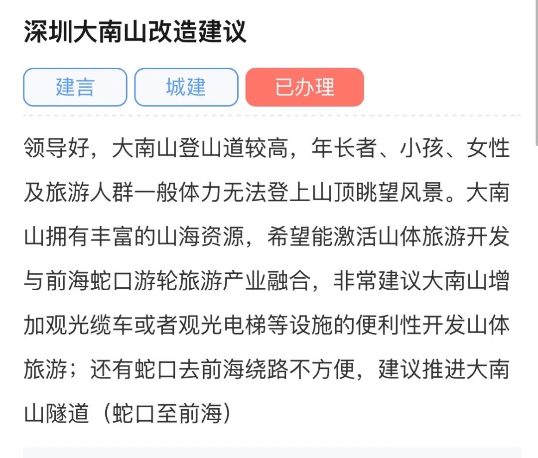 ● 近日,网友发帖建议“改造深圳大南山”,对此,南山区城管和综合执法局回应:仍需要调研可行性。详情>>