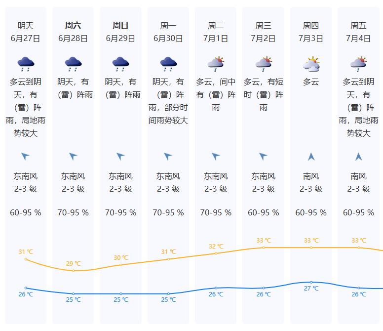 27日多云到阴天,有间歇性(雷)阵雨;