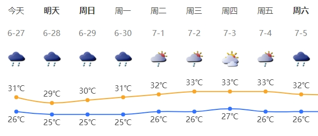 27日,粤西市县中到大雨转阴天,梅州、粤东市县多云转中雷雨局部暴雨,其余市县阴天到多云,有(雷)阵雨局部大雨。最高气温:中北部、雷州半岛市县31~33℃,其余市县28~31℃。