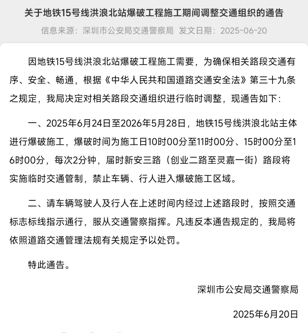 ● 宝安:2025年6月24日至2026年5月28日,新安三路(创业二路至灵嘉一街)路段将实施临时交通管制。