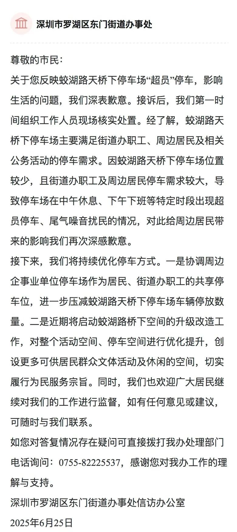 ● 近日,网友发帖称罗湖区蛟湖路天桥下停车场塞满了车,对此,罗湖区东门街道办事处回应:深表歉意,将持续优化停车方式。