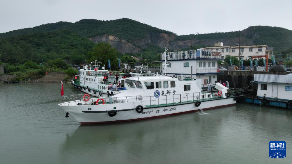 6月28日,“氨晖号”停靠在码头,准备在安徽合肥巢湖水域首航(无人机照片)。新华社记者 周牧 摄
