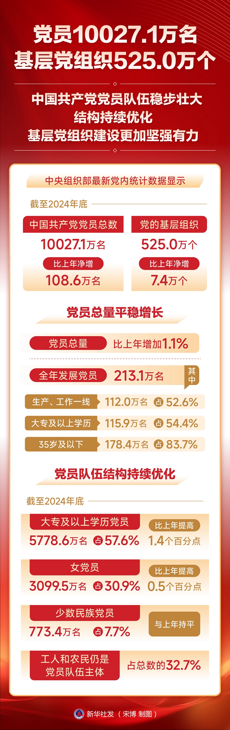 新华社北京6月30日电 中央组织部最新党内统计数据显示,截至2024年底,中国共产党党员总数为10027.1万名,比上年净增108.6万名。党的基层组织525.0万个,比上年净增7.4万个。中国共产党坚持用改革精神和严的标准管党治党,着力建强基层组织、锻造过硬队伍,为以中国式现代化全面推进强国建设、民族复兴伟业提供坚强组织保证。