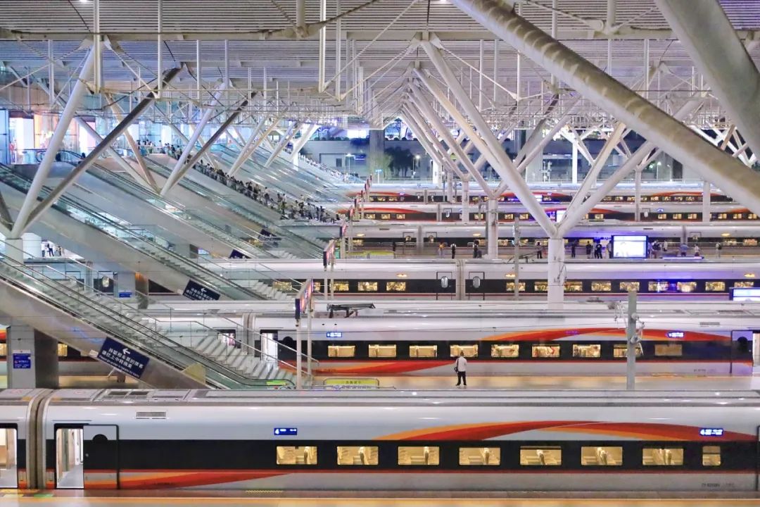 作为粤港澳大湾区的重要铁路枢纽,深圳北站线路繁忙、客流量大。三季度调图后,深圳北站、长沙南站同步开行整点标杆列车,往返共计8趟,时速350公里的复兴号开行更加密集,极大丰富旅客的出行选择。