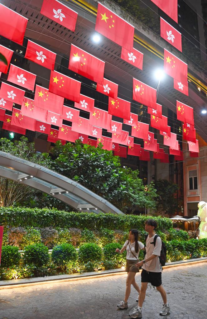 在湾仔利东街,悬挂整齐的五星红旗与特区区旗组成了壮观的“旗海”。当夜幕降临,整条街道在流光溢彩的灯光映衬下,勾勒出亮丽图景。从四面八方而来的市民和游客或驻足观赏,或拿起手机,定格这美丽的画面。