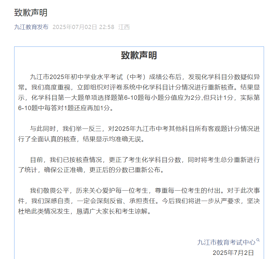 ● 近日,江西九江市多位考生及家长反映,中考化学成绩疑似少算分。7月2日,九江市教育考试中心发布致歉声明。
