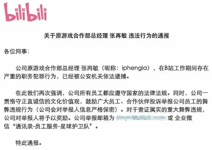 ● 7月2日,B站在内部邮件中通报,原游戏合作部总经理张再敏在B站工作期间存在严重的职务犯罪行为,已经被公安机关依法逮捕。