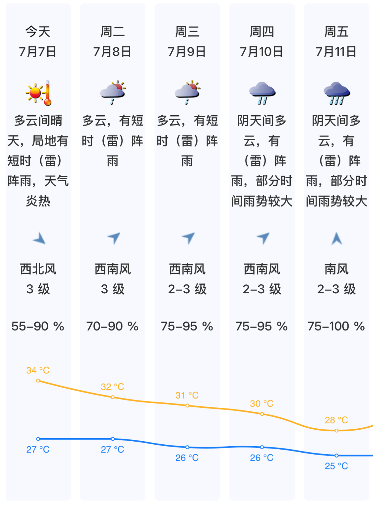 从7日开始,降雨范围将进一步扩大。全省大部转为多云天气,有分散(雷)阵雨,局部地区可能出现暴雨,雷雨时局地还可能伴有8级左右的短时大风。
