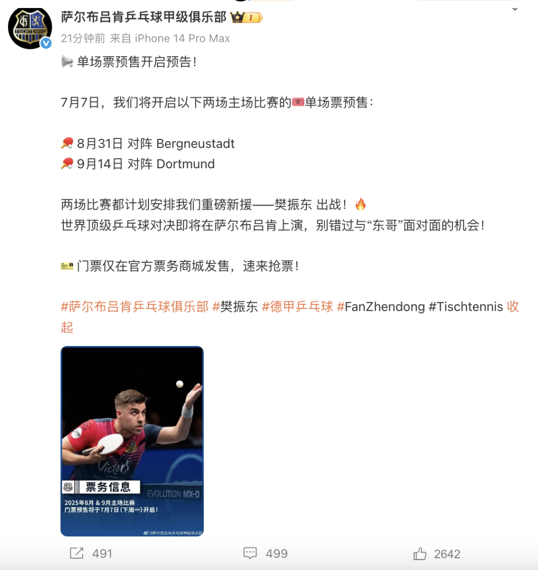 ● 官方宣布!樊振东确定8月31日德甲首秀。