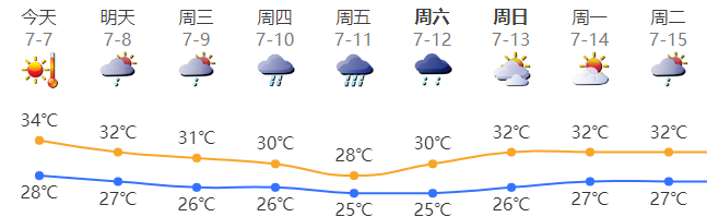 深圳今日多云间晴天,局地有短时(雷)阵雨,天气炎热;气温28-34℃,中北部和人口密集区最高气温可达36℃或以上;西南风3级;相对湿度55%-90%。