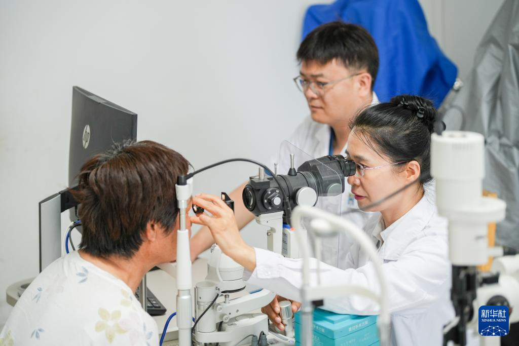在新疆伊犁哈萨克自治州中医医院,江苏援疆医生郭云柯(前)与本地医生一同探讨病例(2025年7月6日摄)。 新华社记者 徐宏岩 摄 在新疆伊犁哈萨克自治州中医医院,江苏援疆医生林琳(右)与本院眼科主任王庆一同为患者进行眼部检查(2025年7月6日摄)。 新华社记者 徐宏岩 摄