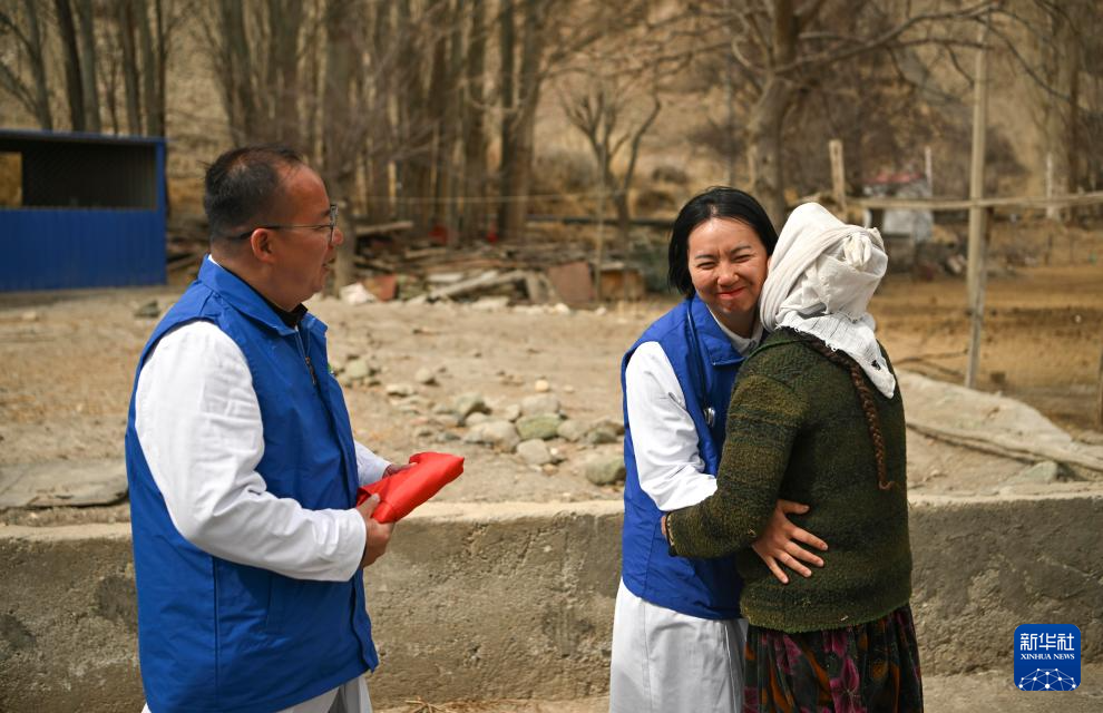 新疆塔什库尔干塔吉克自治县库科西鲁格乡的一名年长村民(右)拥抱上门送诊的深圳援疆医生(2025年3月24日摄)。 新华社记者 胡虎虎 摄 在新疆塔什库尔干塔吉克自治县库科西鲁格乡卫生院,深圳援疆重症医学科医生杨正月(右)和乡卫生院医生一起为村民检查身体(2025年3月24日摄)。 新华社记者 胡虎虎 摄