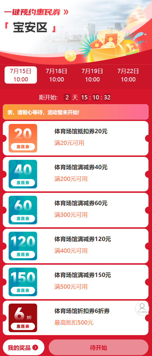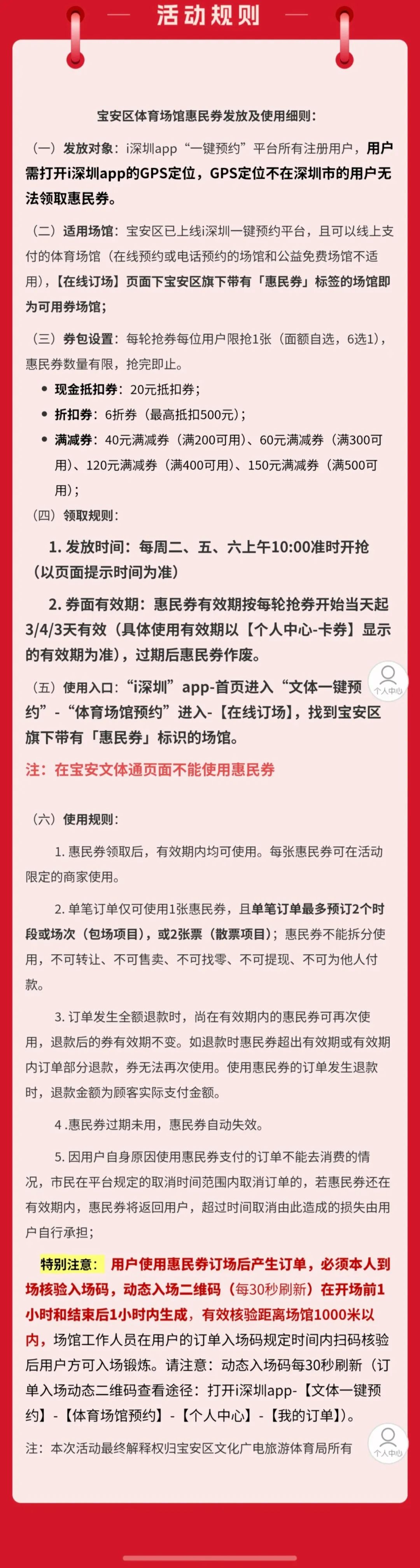 ● 宝安:宝安体育惠民券来袭!每轮发放1万张,每轮150万元,每周二、周五、周六10点开抢!