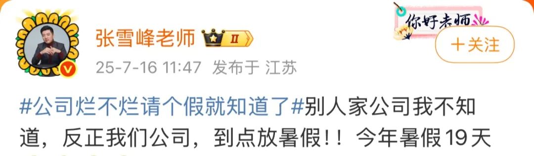 ● 7月16日,网红名师张雪峰发博宣布公司开始放暑假共19天。