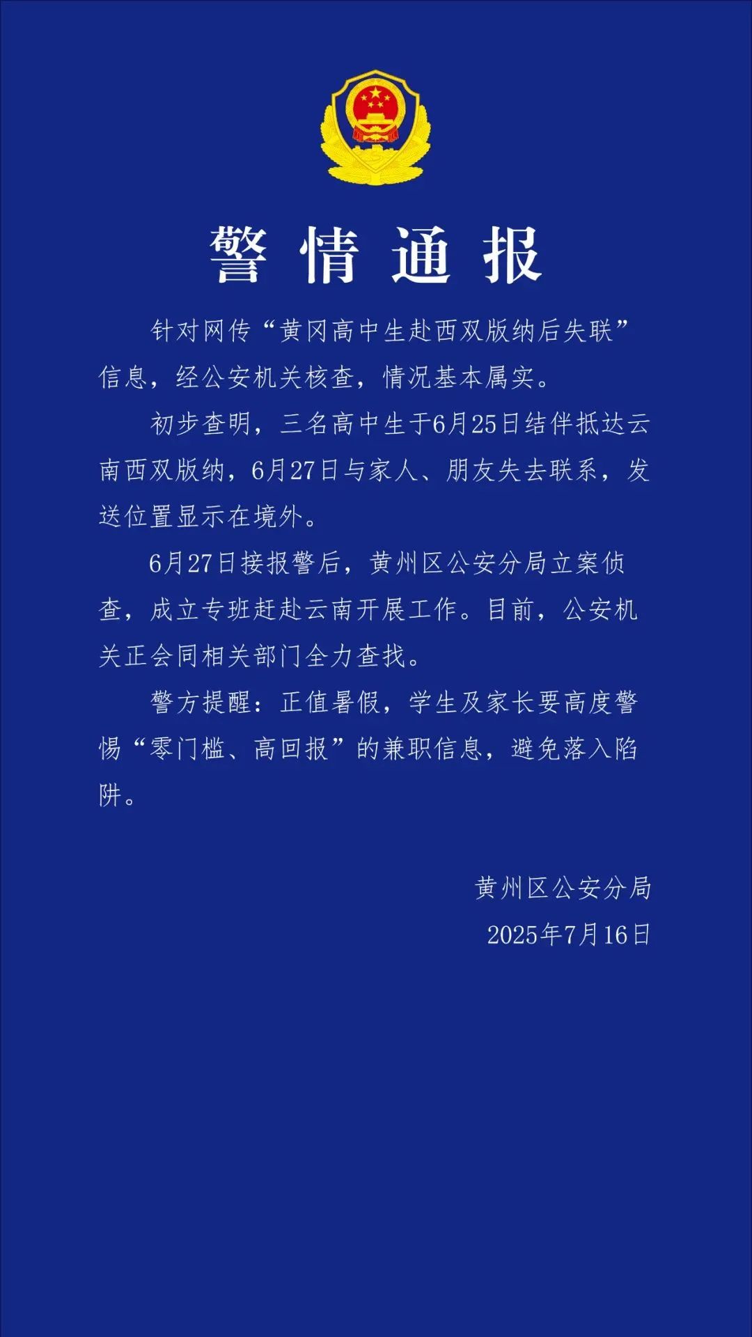 ●湖北警方通报“3名高中生赴西双版纳后失联20余天”:情况基本属实,已立案侦查,成立专班赶赴云南开展工作。