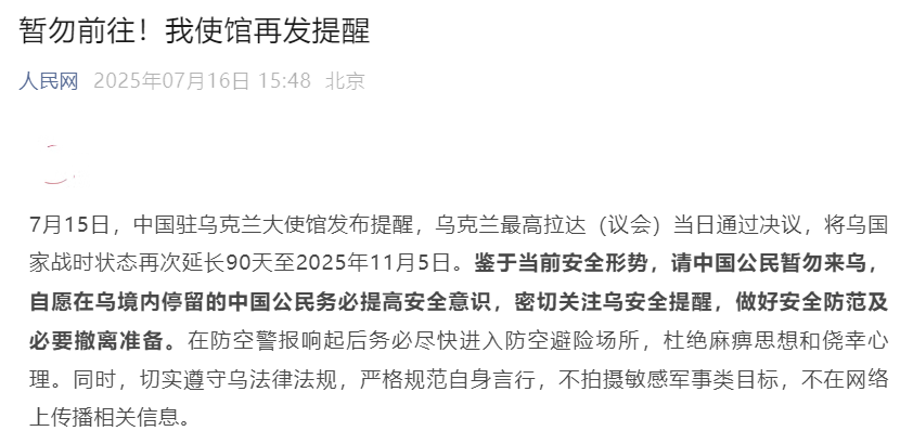● 7月15日,中国驻乌克兰大使馆发布提醒,鉴于当前安全形势,请中国公民暂勿来乌。