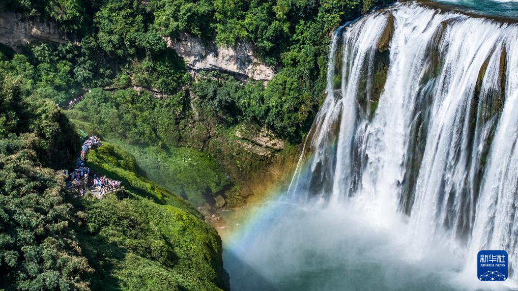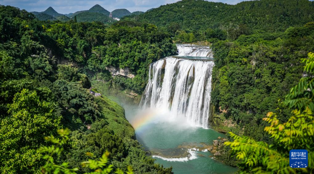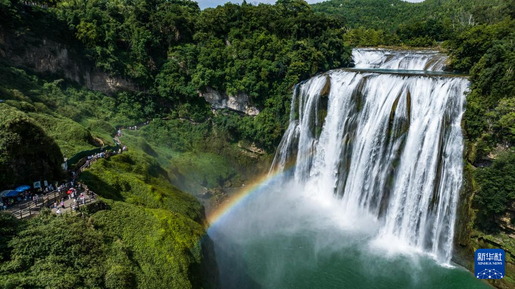 近日,位于贵州省安顺市的黄果树瀑布景区正处于夏日最佳观赏期。黄果树大瀑布水势磅礴,在阳光的照射下,瀑布前架起一道彩虹,美丽的景象吸引各地游客前来观赏游玩。
