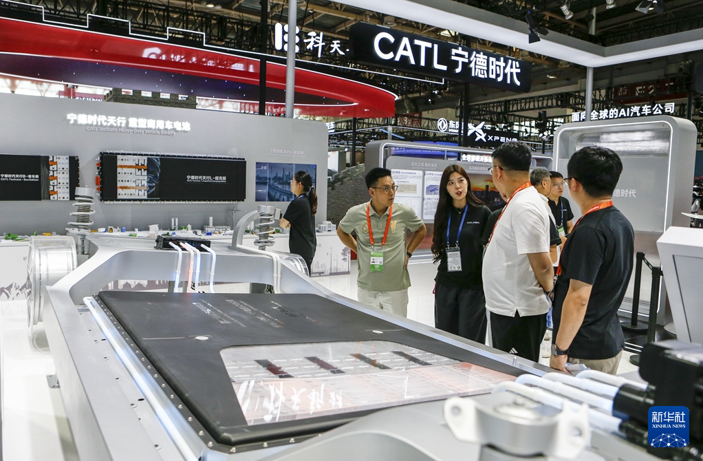 7月16日,参会者在智能汽车链展区了解宁德时代神行PLUS电池。新华社记者 丁洪法 摄