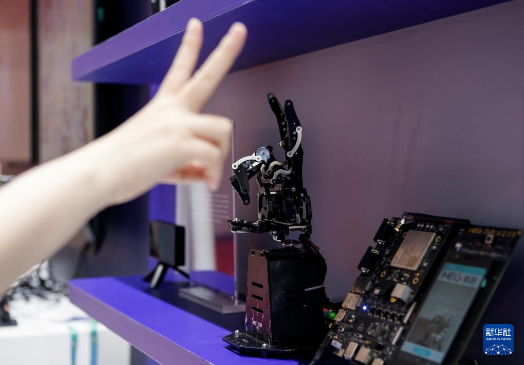7月17日,在数字科技链展区高通展台,参会者与智能仿生手掌互动。新华社记者 丁洪法 摄