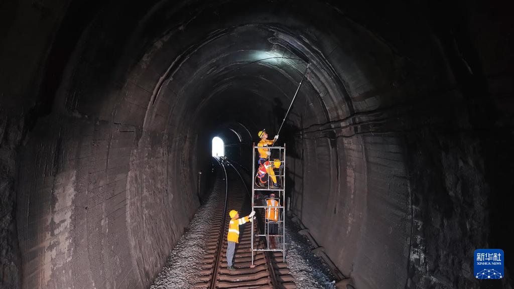 桥隧工人对隧道顶部危石隐患点进行加固(7月15日摄,无人机照片)。新华社记者 张爱林 摄
