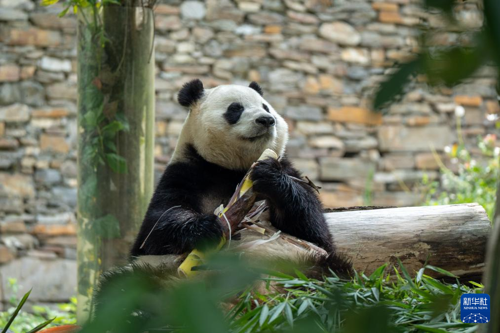 7月17日,大熊猫福宝在吃竹笋。新华社记者 薛晨 摄