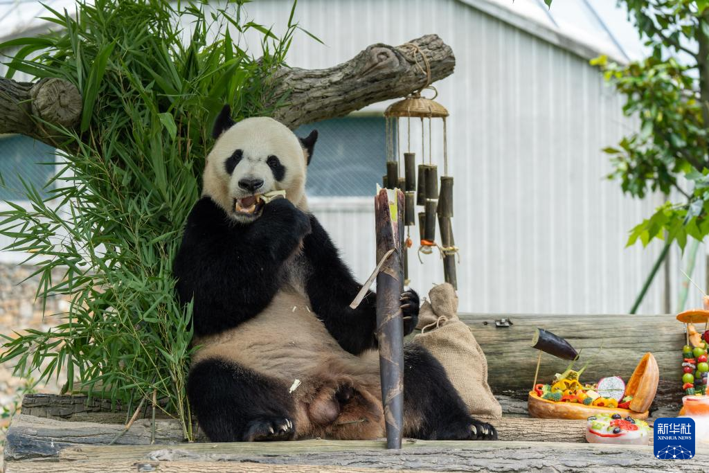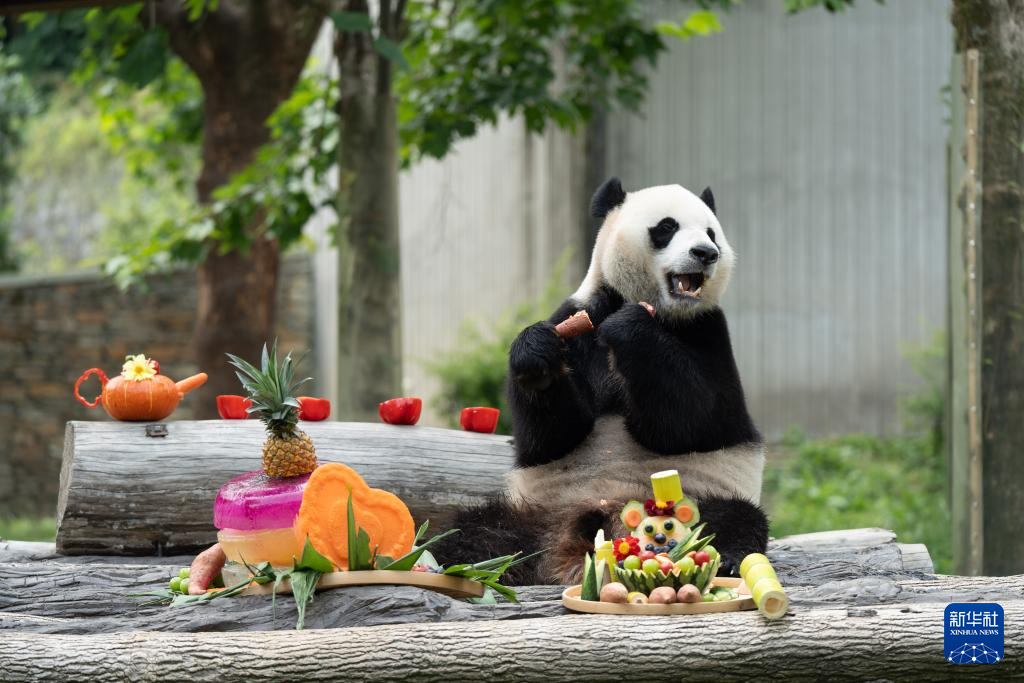 7月17日,大熊猫小奇迹在享用美食。新华社记者 薛晨 摄