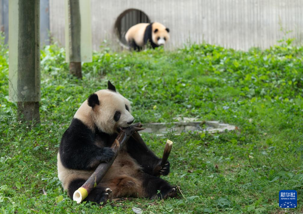 7月17日,卧龙神树坪基地的大熊猫在吃竹笋。新华社记者 薛晨 摄