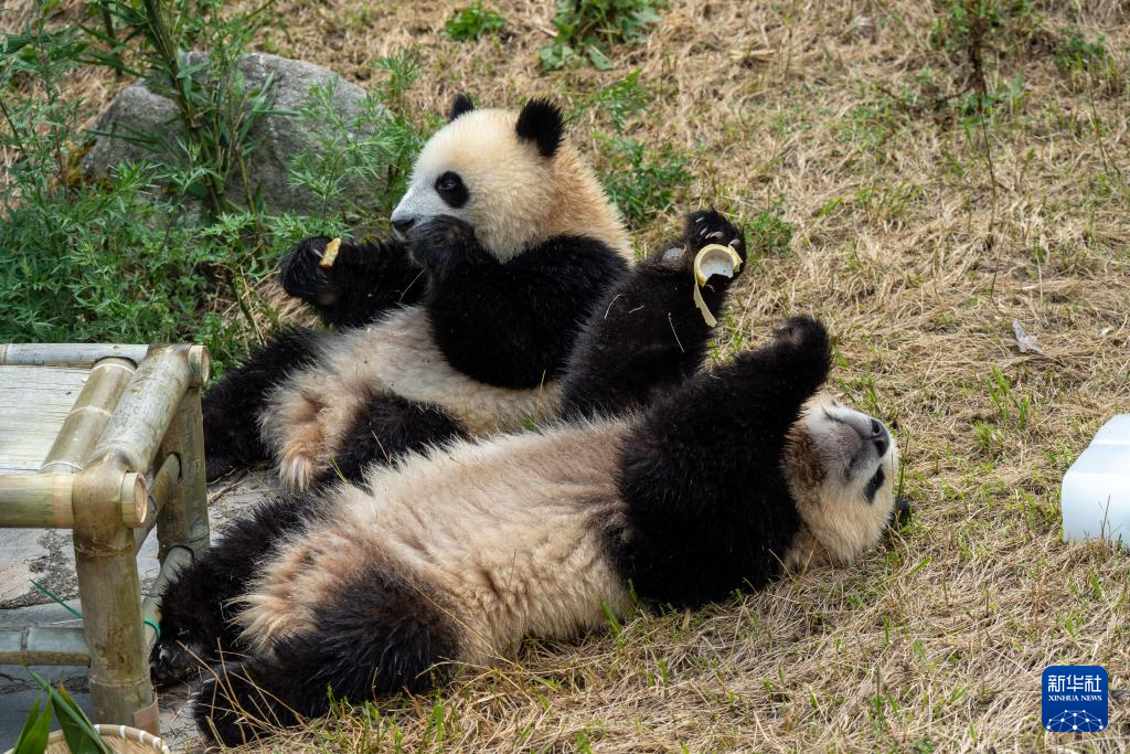7月17日,大熊猫喜豆的幼崽仰躺着品尝美食。新华社记者 薛晨 摄