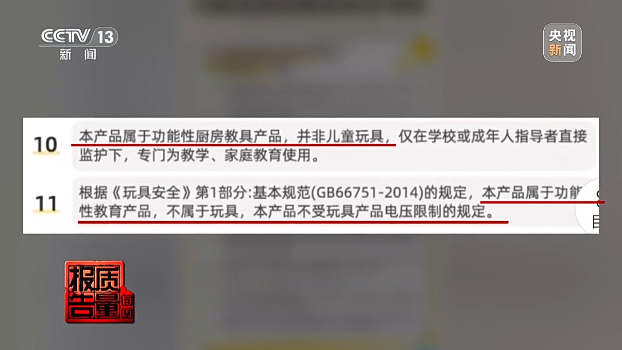 记者浏览电商平台发现,商家在推荐产品中,都在页面明显位置标注为儿童玩具。但是记者翻看这款产品的介绍下拉到最末端时,却看到商家注明的两点说明:一是本产品属于功能性厨房教具产品,并非儿童玩具;另一个是本产品属于功能性教育产品,不属于玩具,本产品不受玩具产品电压限制的规定。与醒目位置标注的“儿童玩具”明显自相矛盾。