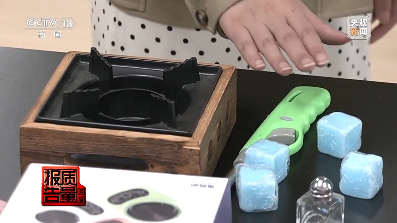上海市质检院有限公司轻化所工程师 宋子珺:一种是里面含有一个电热炉,它的电压是220V。那玩具中要求电压是不能超过24V的。第二,它的加热源用的是比如说像这样的固体酒精,这种其实是高度易燃的固体;另外,有一些产品配的是这样的一个点火枪,里面用到的是一些易燃的气体,也是会有烧伤的风险。
