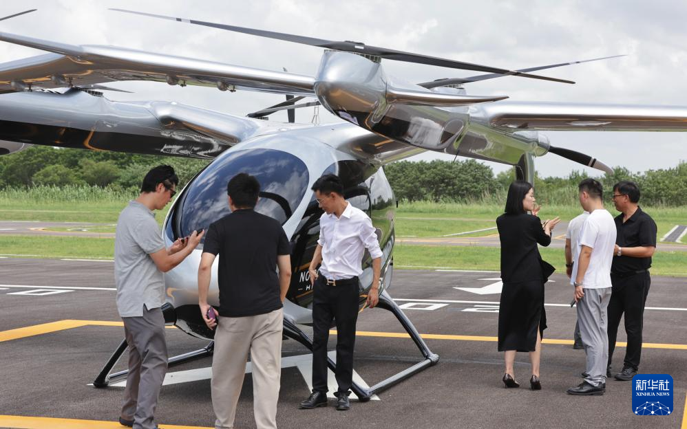 7月22日,参观者在V2000CG凯瑞鸥电动垂直起降航空器旁交流讨论。新华社记者 方喆 摄