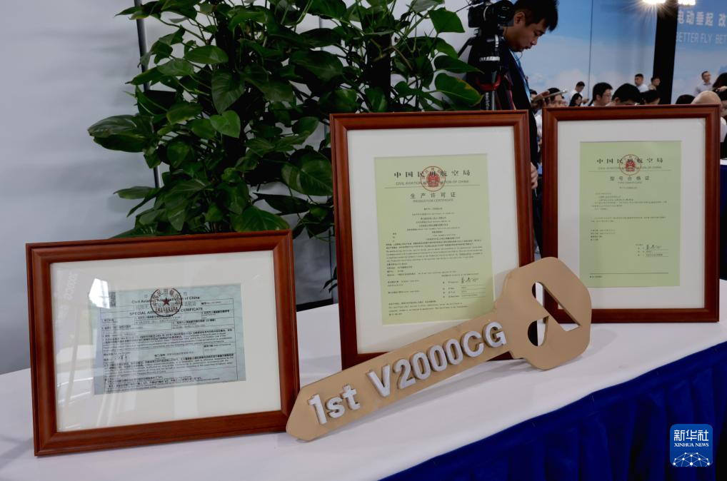 这是在交付仪式现场展示的V2000CG凯瑞鸥电动垂直起降航空器的“适航三证”(7月22日摄)。新华社记者 方喆 摄