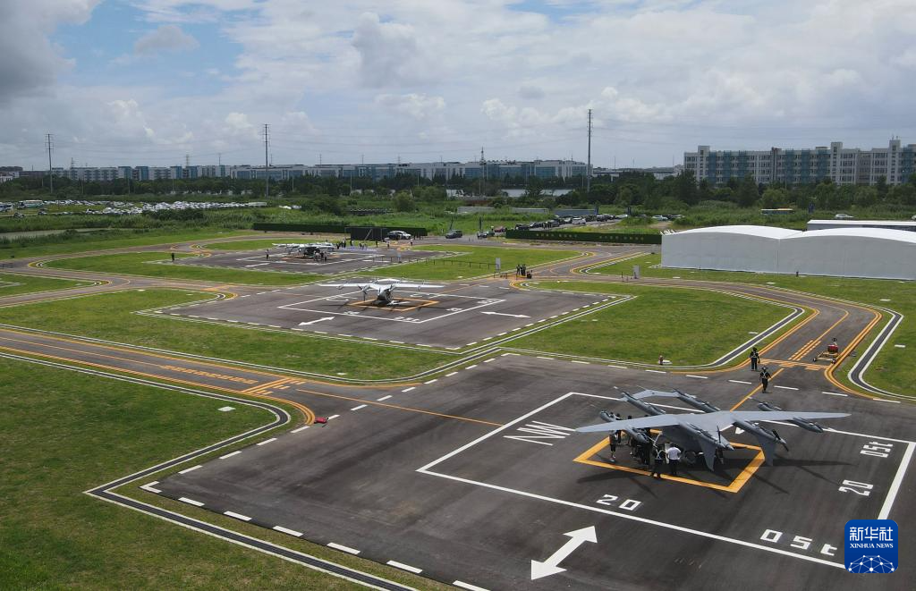 空中俯瞰停在机坪上的V2000CG凯瑞鸥电动垂直起降航空器(7月22日摄,无人机照片)。